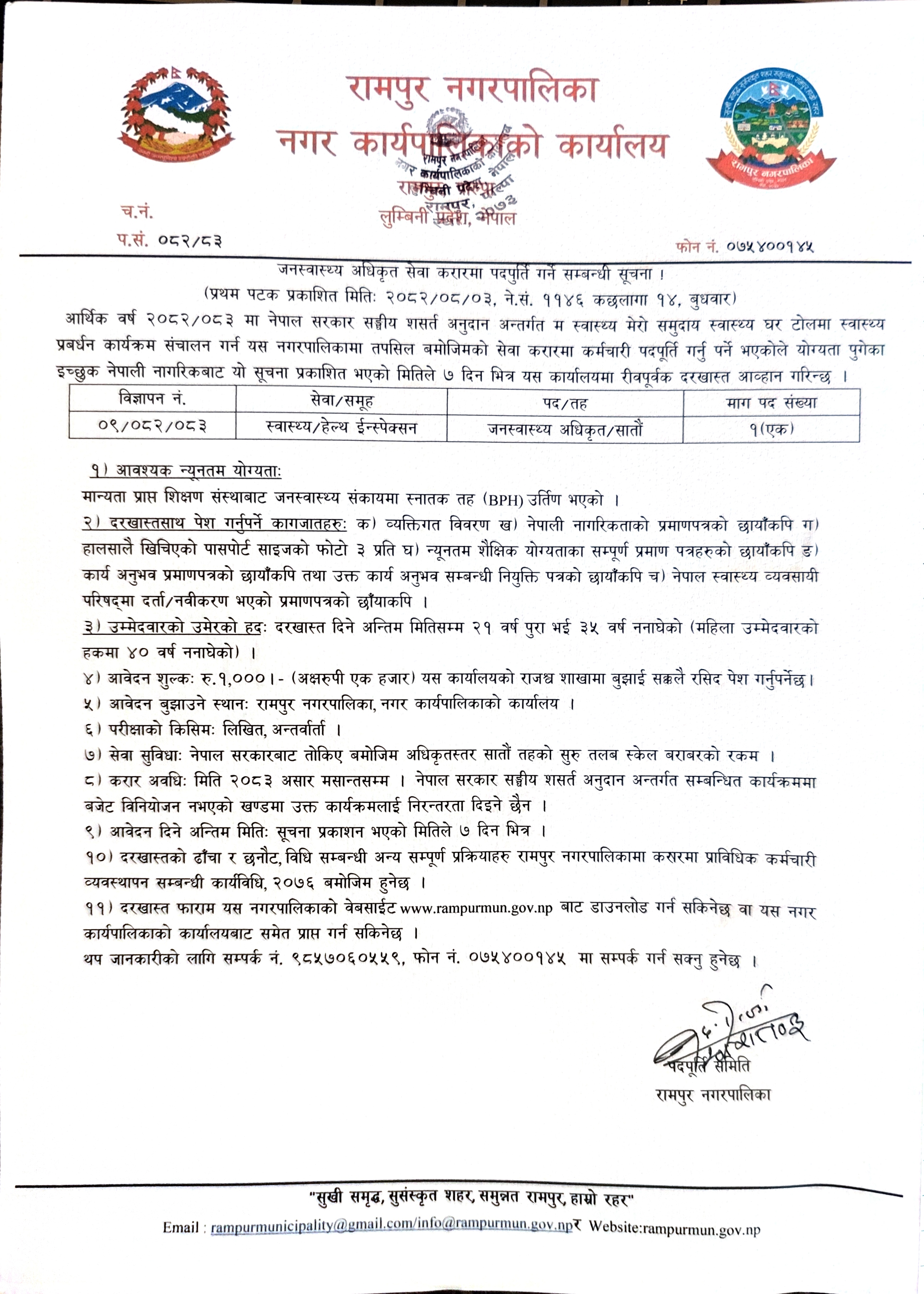 जनस्वास्थ्य अधिकृत सेवा करारमा पदपुर्ती गर्ने सम्बन्धी सूचना ।