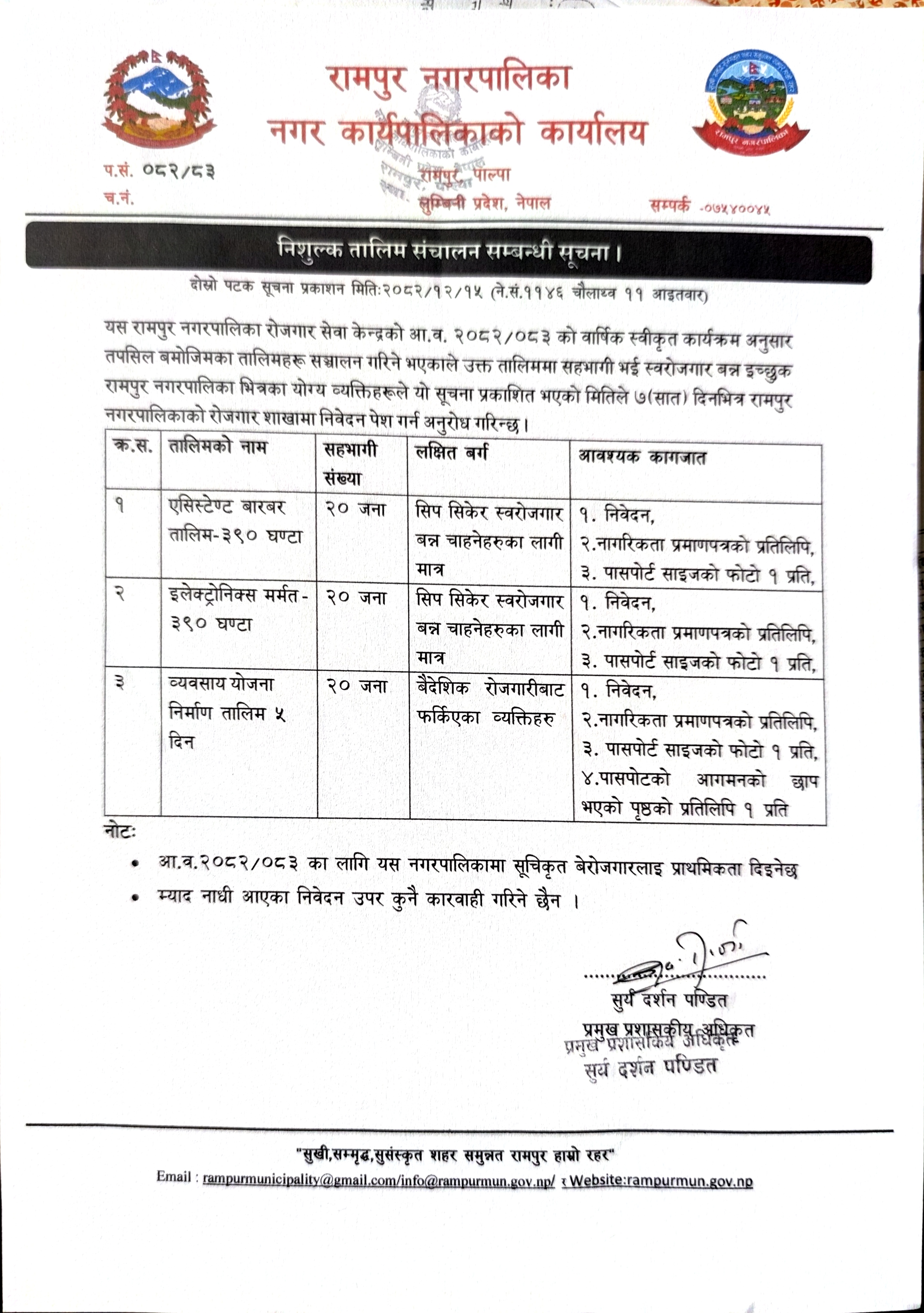 » निशुल्क तालिम संचालन सम्बन्धी सूचना ।
