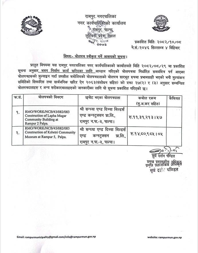 बोलपत्र स्वीकृत गर्ने आसयको सूचना ।