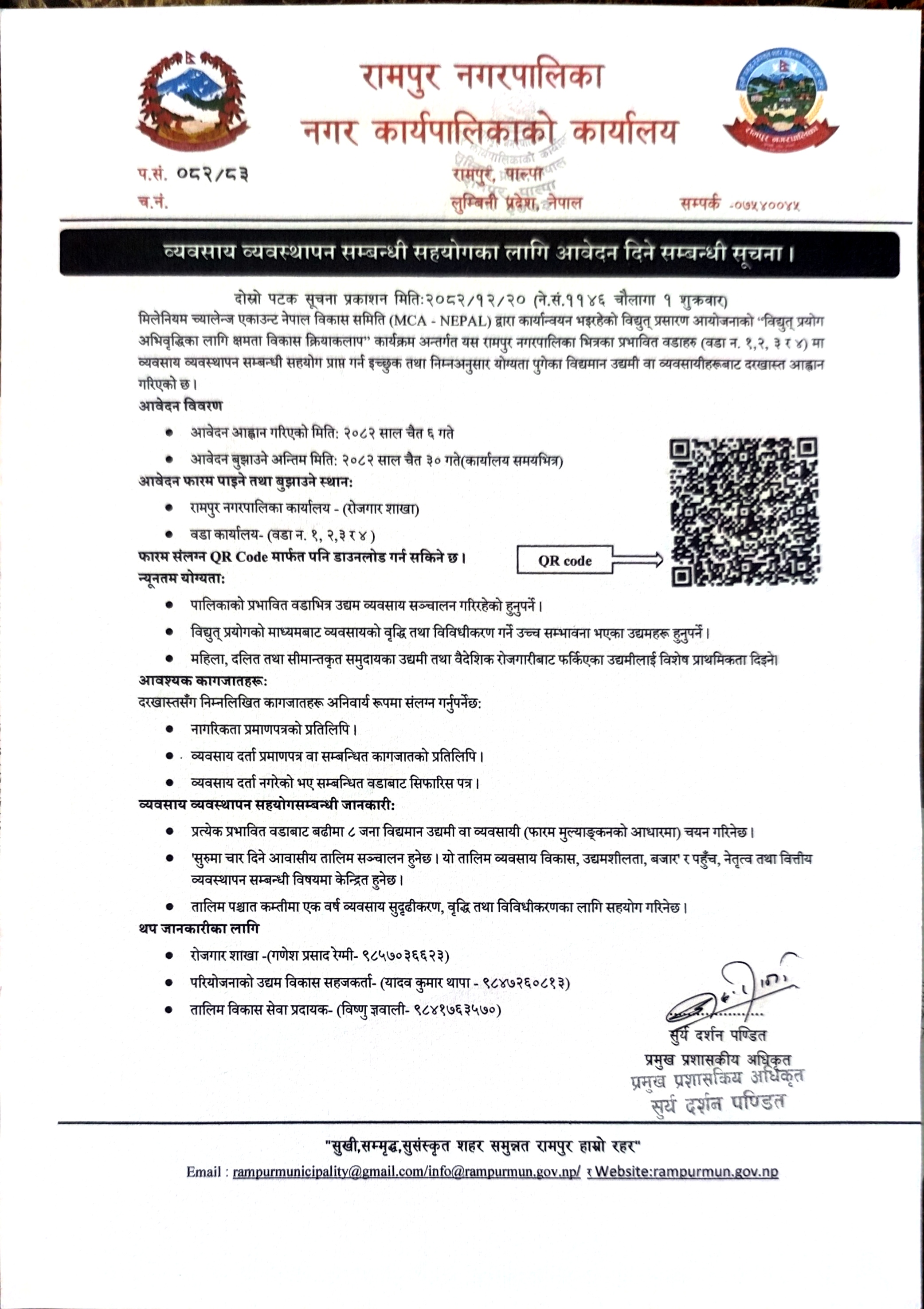 » व्यबसाय व्यवस्थापन सम्बन्धी सहयोगका लागि आवेदन दिने सम्बन्धी सूचना ।