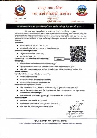 व्यबसाय व्यवस्थापन सम्बन्धी सहयोगका लागि आवेदन दिने सम्बन्धी सूचना ।