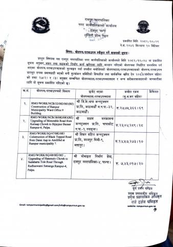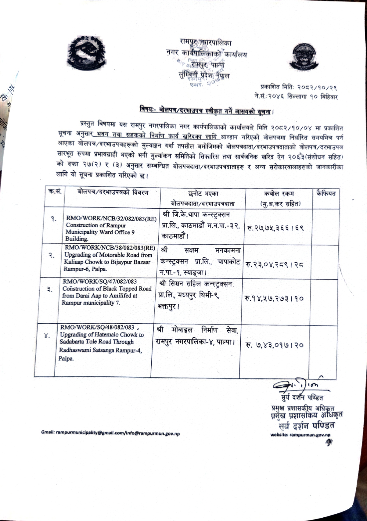 बोलपत्र /दरभाउपत्र स्वीकृत गर्ने आसयको सूचना ।