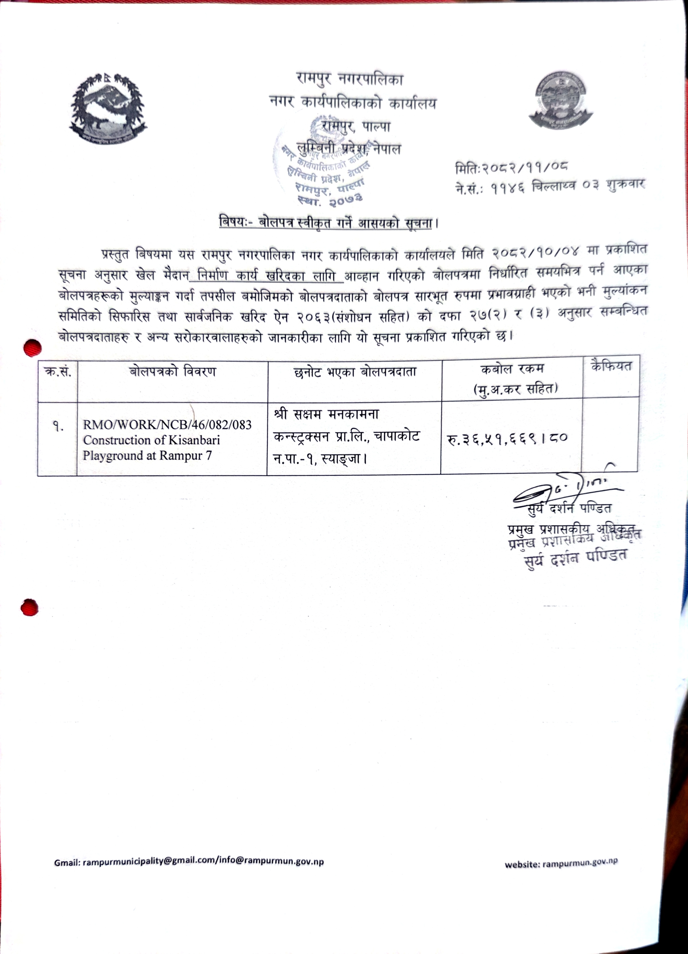 बोलपत्र स्वीकृत गर्ने आसयको सूचना ।
